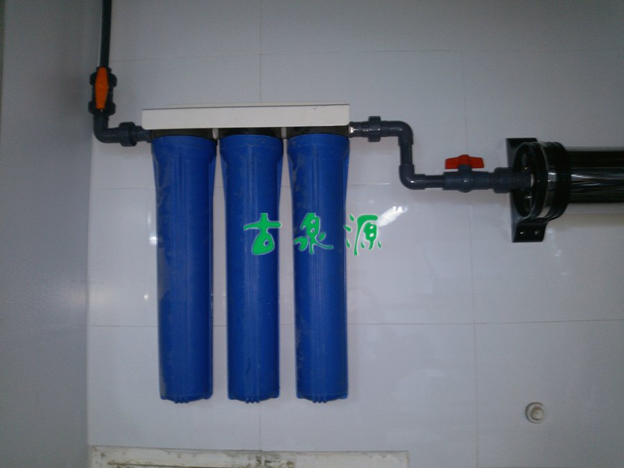 項(xiàng)目因?yàn)槭羌矣?,所以安裝快速簡(jiǎn)單,從送貨到驗(yàn)收一共只用去了半天的時(shí)間。前置預(yù)處理我們采用了三個(gè)單級(jí)過(guò)濾器的串聯(lián),分別應(yīng)用了5μmPP棉、顆?;钚蕴?、1μmPP棉,將水中的大于1μm的雜質(zhì)顆粒等除掉,并且可以有效的保護(hù)超濾膜的使用壽命。